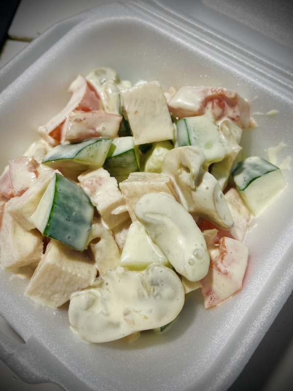 Огірок, кукурудза, крабові палички, яйце, цибуля, майонез